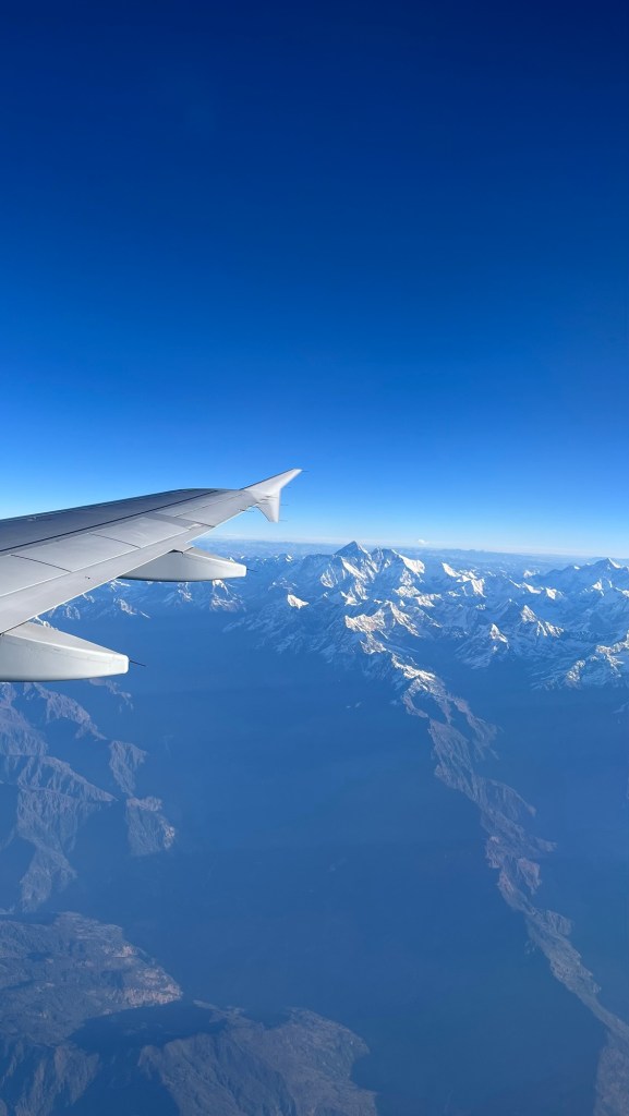 The one benefit of getting up at 4a to get to the airport is that I got assigned a window seat on the right side of the plane – with a beauteous view of the Himalayas.