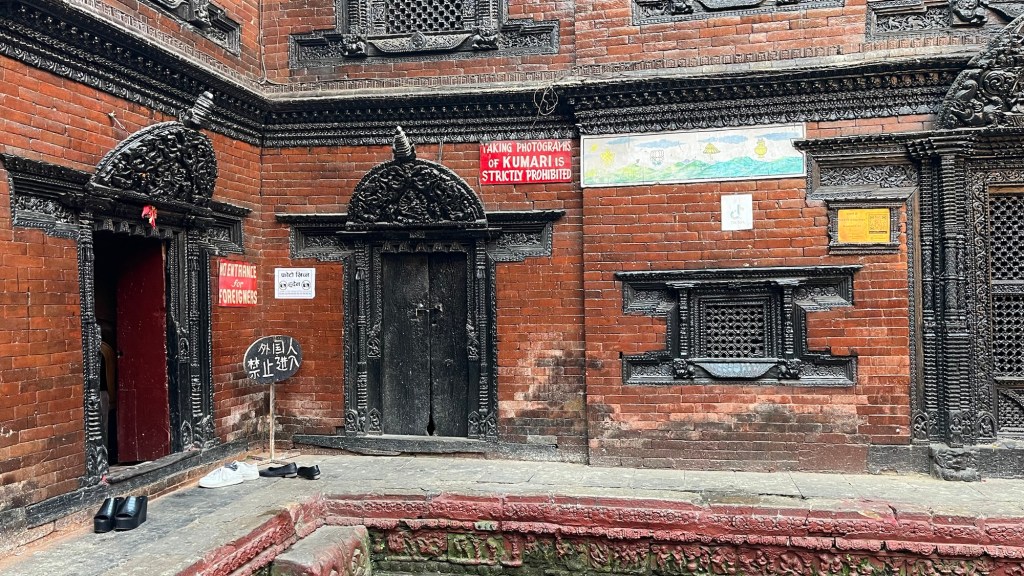 …the Kumari (living goddess) residence was open today. The Kumari is controversial – there is just something hinky about declaring that a child is the manifestation of this or that – remember the obnoxious chubby lama? There are a number of Kumari in Nepal but the Kathmandu Kumari is the most important one. She is chosen from a specific community based on looks etc. and has to undergo a test of staying in a dark room overnight without freaking out. If recognized as being the vessel of the goddess, she lives a secluded life in her palace – her feet must never touch the commoner’s ground – blessing supplicants. Her tenure is up after first menstruation or after a major injury or blood loss. Sure sounds like child abuse. Conditions improved after this tell-all was published but, still.