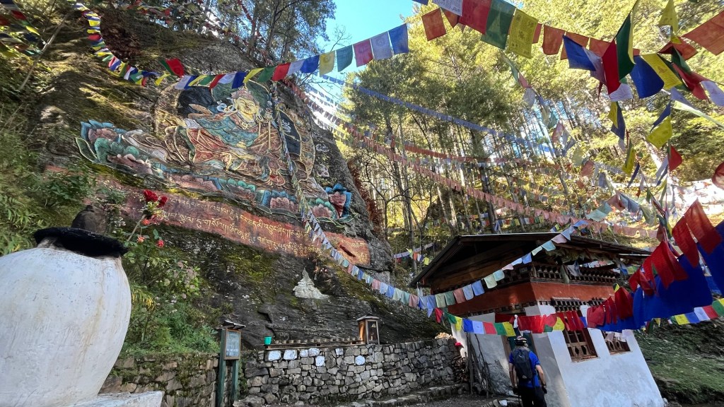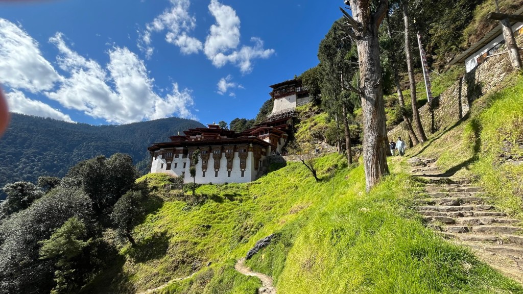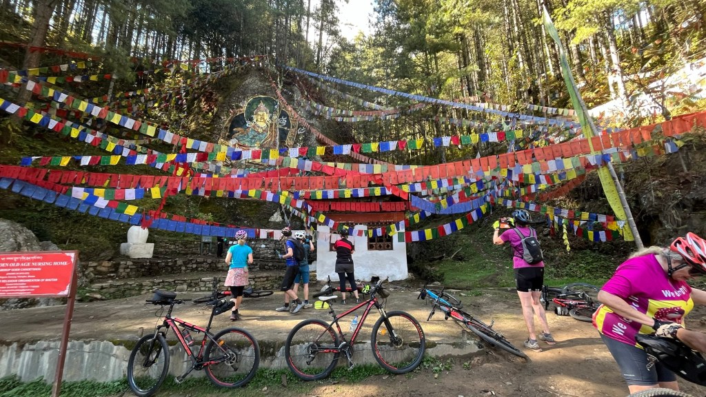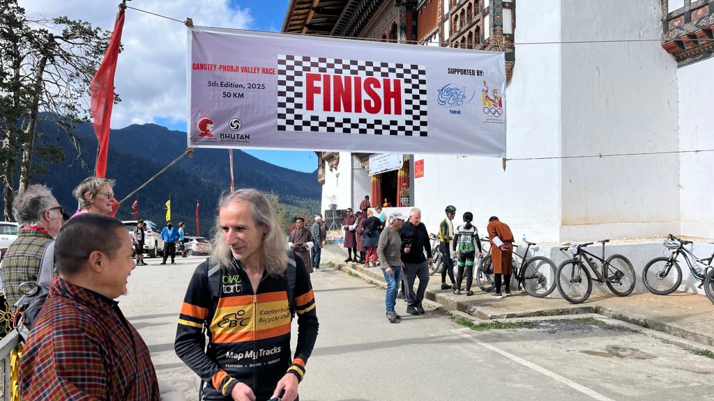 Heading up to the monastery, cyclists kept whizzing by including one young woman! The finish line was at the monastery entrance where we congratulated the winner, a young American man who now lives in Bhutan.