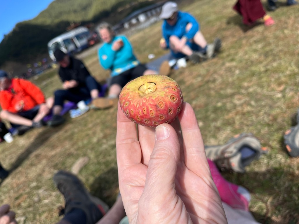 Our home stay host met us with a picnic lunch next to a valley temple – rice, pork&radish, veg and, as always, chillies and cheese which, as always, I passed on. Desert was apple wedges and this bitter tasting fruit which I shared with the crows.